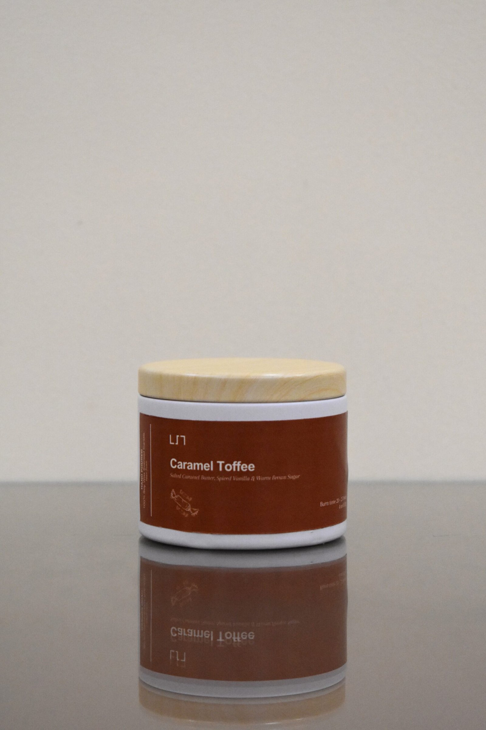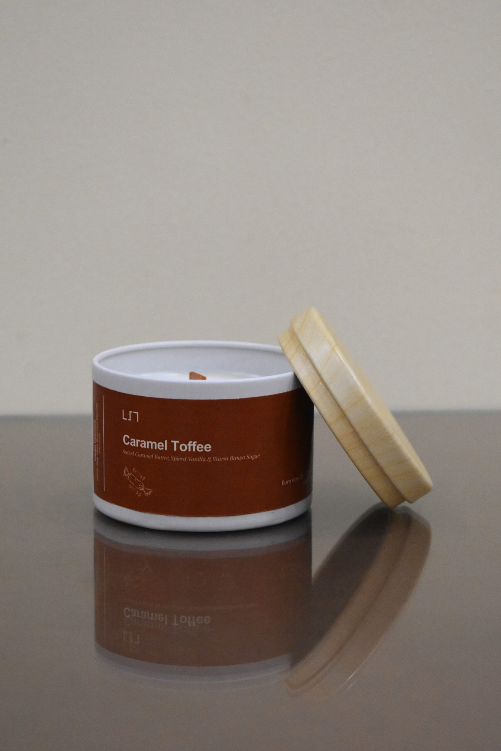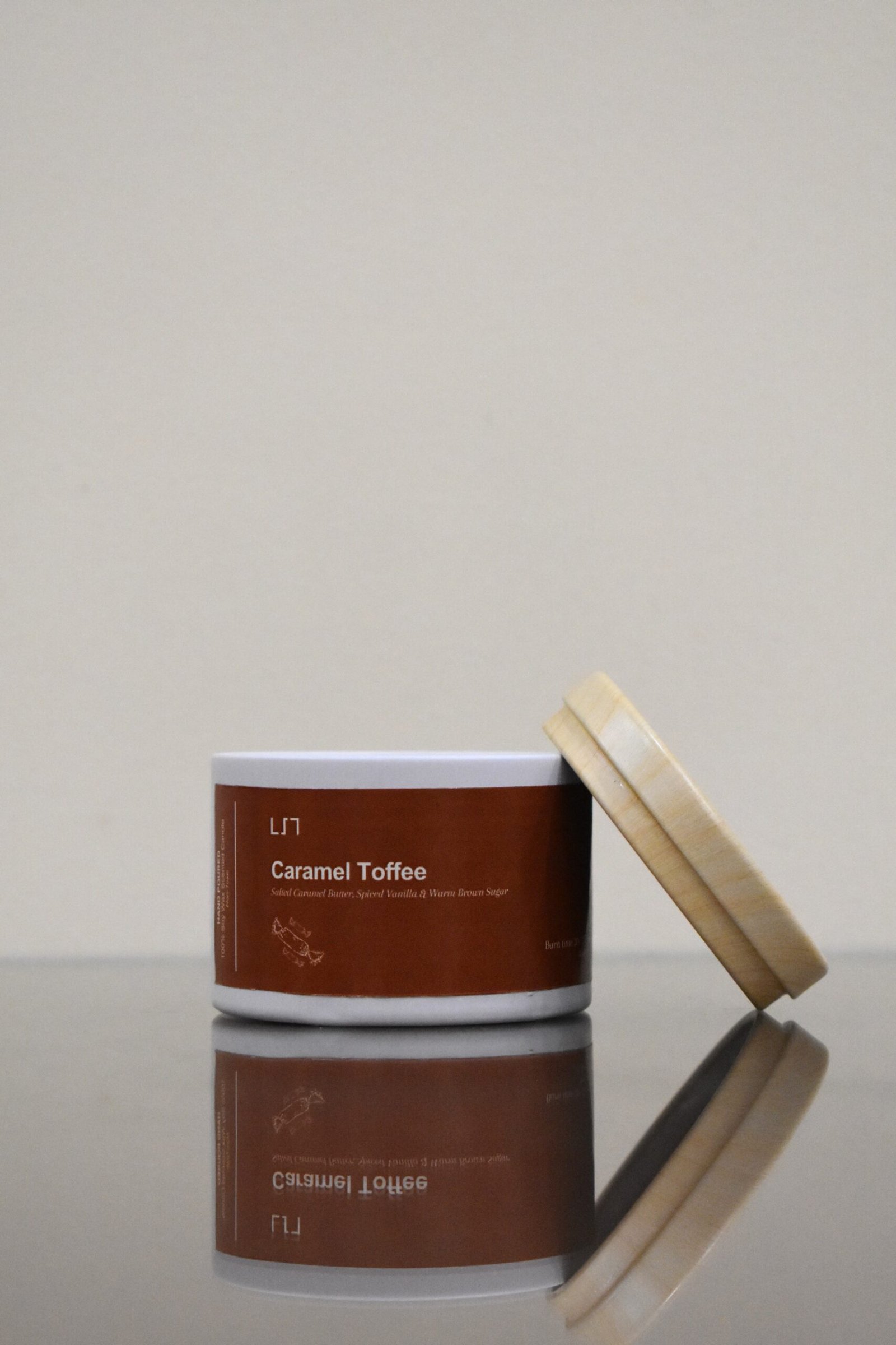 A larger dose of a richer pour of creamy caramel and golden toffee wrapped in buttery warmth and a subtle hint of vanilla—sweet indulgence captured in a clean white tin topped with a warm bamboo-look lid—a balance between cozy decadence and refined modern style.