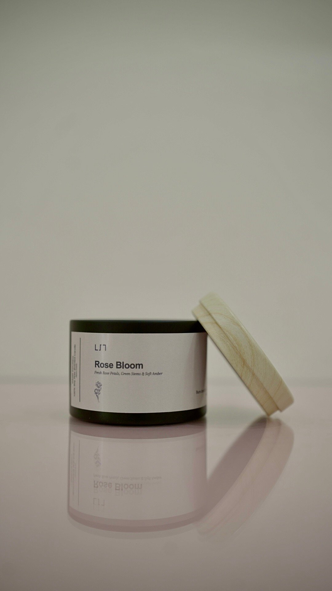 A delicate blend of fresh rose petals, green stems, and soft amber encased in a bold black tin topped with a warm bamboo-look lid—a modern fusion for romance and long-lasting charm